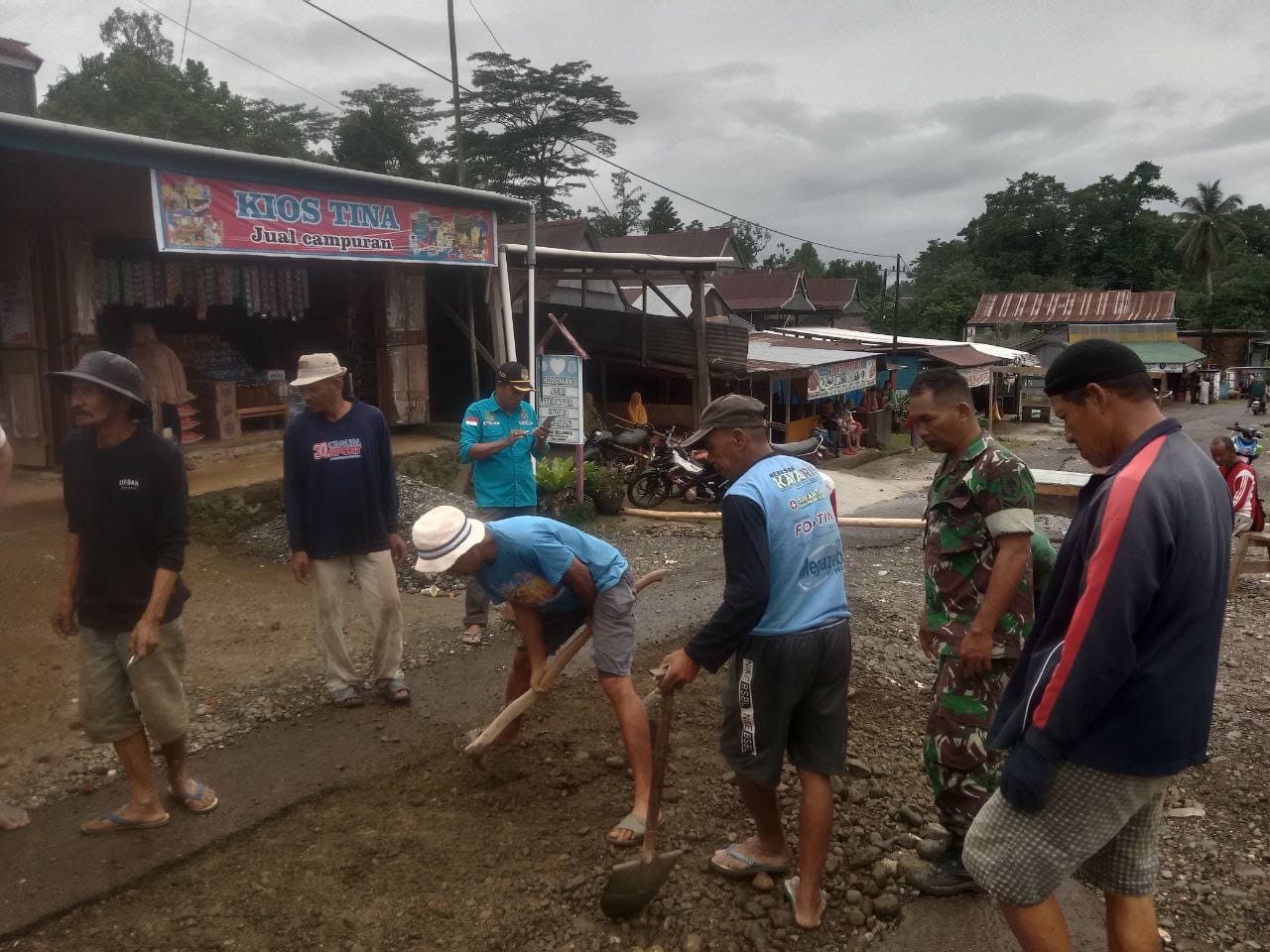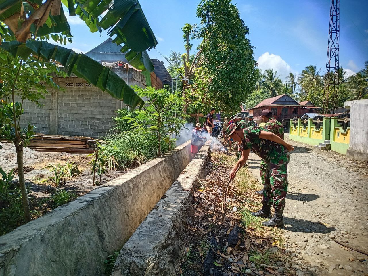 Warga bersama jajaran Koramil tampak kompak bahu membahu membersihkan saluran air yang penuh ditutupi rumput yang sudah tinggi tinggi dan sampah yang menggangu aliran air tidak lancar.