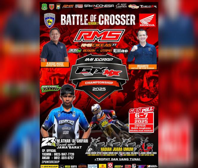 Sidrap, Sidraptimur.com – Ajang balap motor tanah bergengsi bertajuk Battle of Crosser Season 2 siap digelar di Kabupaten Sidenreng Rappang (Sidrap) pada 6–7 Desember 2025 mendatang. Event ini akan berlangsung di Sirkuit Bukit Angkasa, Bilokka, Sidrap.
